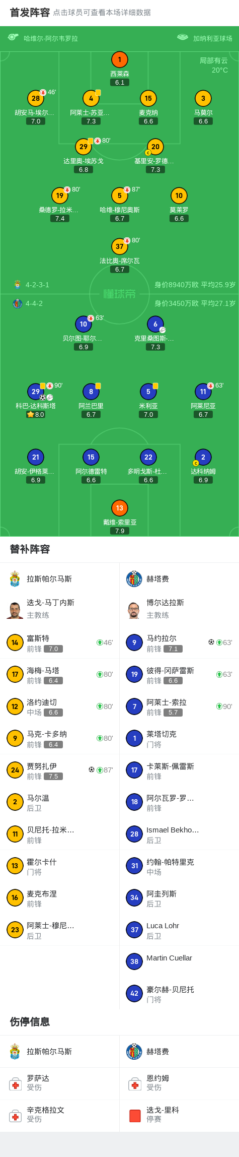 尽管拉斯帕尔马斯在努力抵抗,但在第86分钟,赫塔费再次发起猛攻,科巴-达科斯塔的进球为球队锁定胜局。拉斯帕尔马斯奋力反击,贾努扎伊在第88分钟为球队扳回一城,但最终未能扭转局面,以1-2告负。